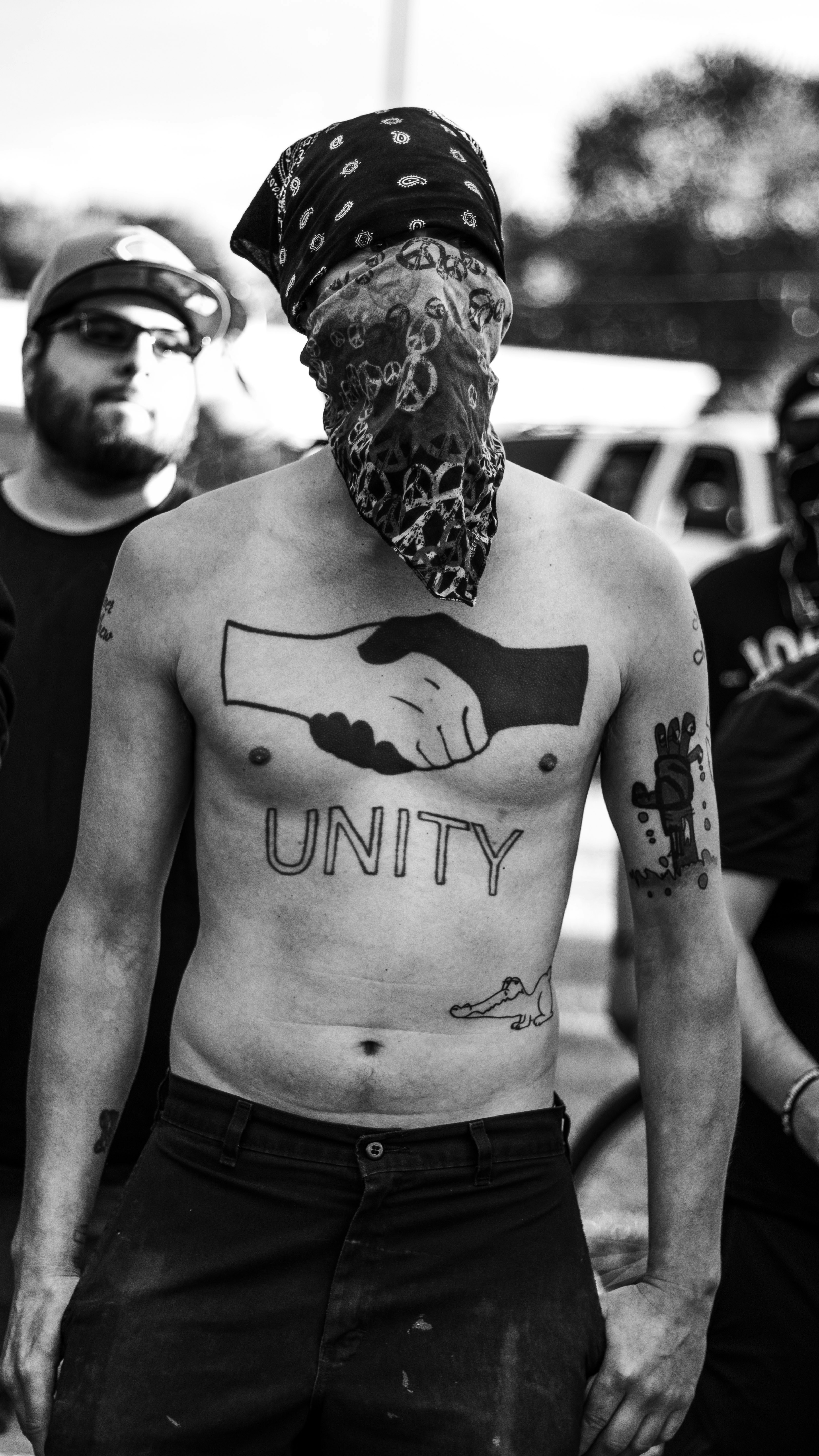 Grayscale Photo Of Man With Skull Tattoo On His Back Photo Free Current Events Image On Unsplash